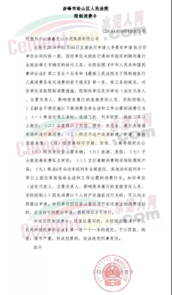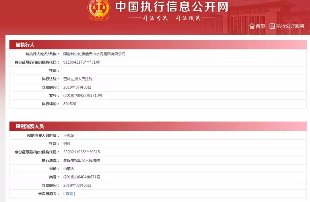 中國執(zhí)行信息公開網(wǎng)信息顯示,被執(zhí)行人為阿魯科爾沁旗鑫天山水泥集團(tuán)有限公司,被限制消費(fèi)人員為王獻(xiàn)金。