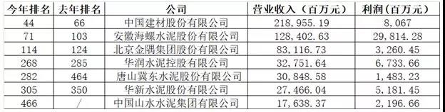 中國500強排行榜名單中包括七家水泥企業分別為:中國建材股份有限公司、安徽海螺水泥股份有限公司、北京金隅集團股份有限公司、華潤水泥控股有限公司、唐山冀東水泥股份有限公司、華新水泥股份有限公司、中國山水水泥集團有限公司。