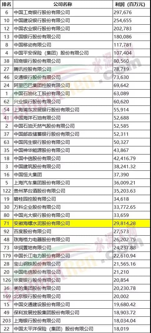 其中水泥行業的龍頭企業,海螺集團以29,814.28百萬元位居最賺錢40強的第27位,百度股份和格力電器居于之后分別位于28位和29位。