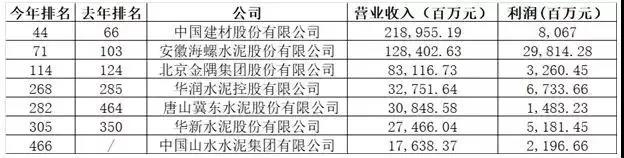 查看榜單得知,與去年排名相比,七家水泥企業(yè)今年的排名都有所上升。排名上升最快的是唐山冀東水泥,較去年排名上升了182位。值得一提的是,去年未入榜的中國(guó)山水水泥今年成功進(jìn)入榜單,排名第466位。