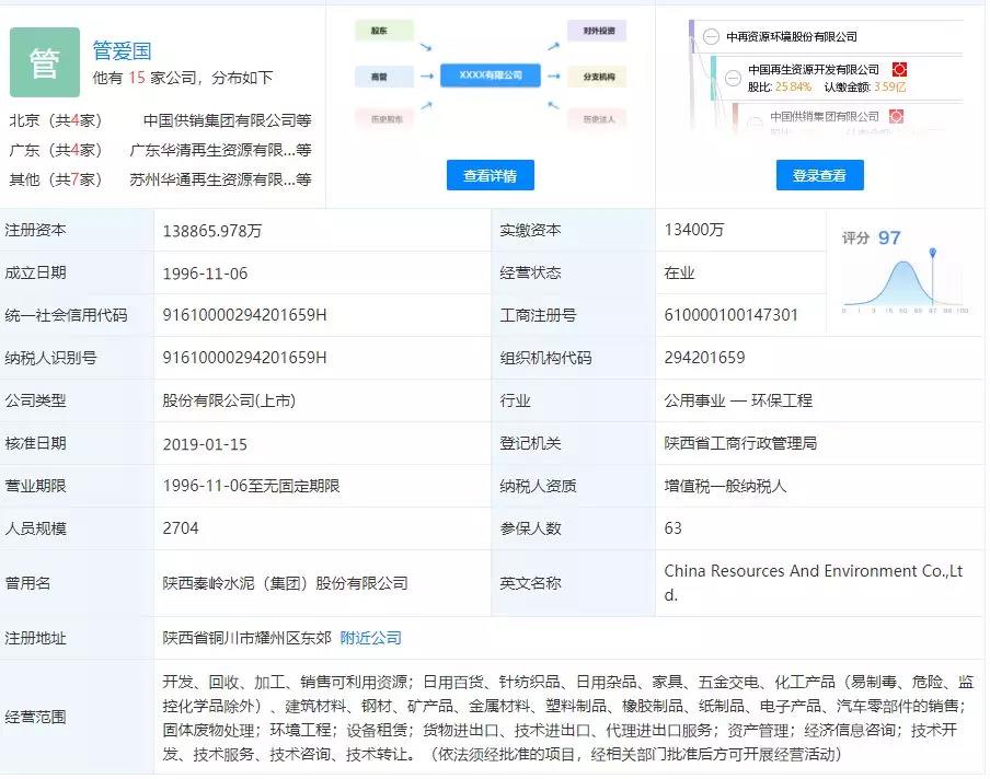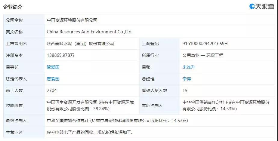 據查詢,這家名為陜西秦嶺水泥的集團公司已改名為中再資源環境股份有限公司。