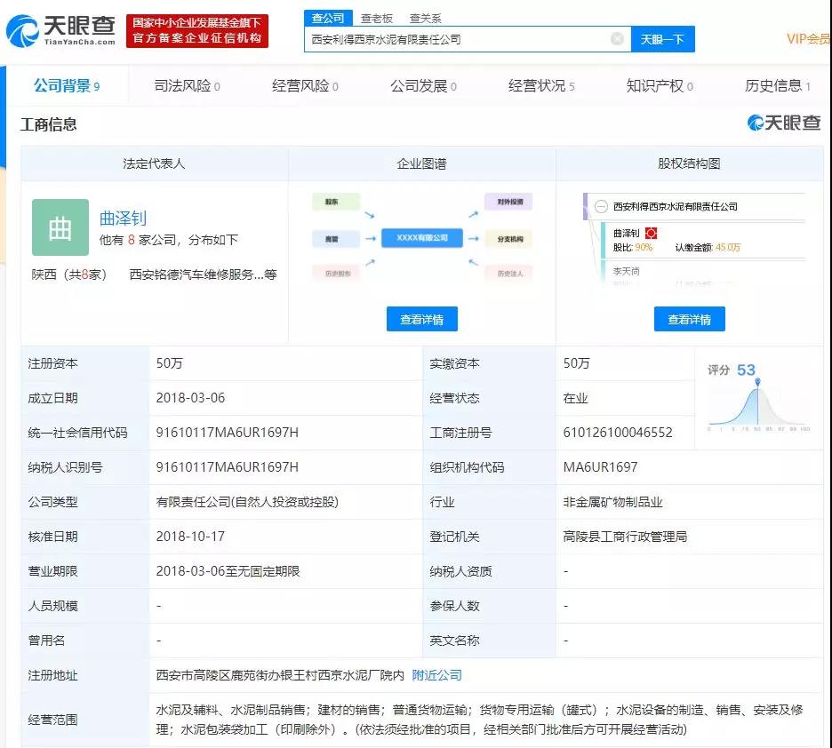 據查詢,這家名為西安利得西京水泥有限責任公司的企業注冊地址位于西安市安陵區鹿苑街辦銀王村西京水泥廠院內。
