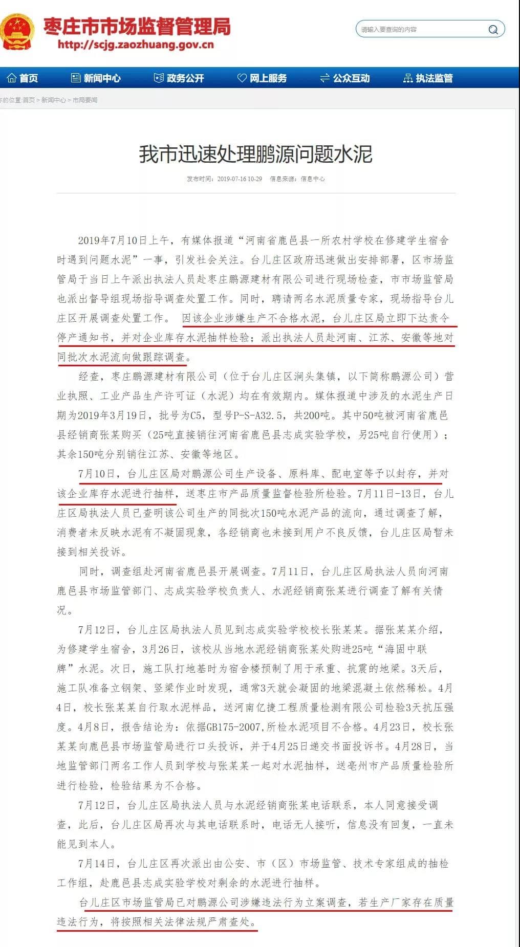 消息稱,7月14日,臺(tái)兒莊區(qū)再次派出由公安、市(區(qū))市場(chǎng)監(jiān)管、技術(shù)專家組成的抽檢工作組,赴鹿邑縣志成實(shí)驗(yàn)學(xué)校對(duì)剩余的水泥進(jìn)行抽樣。目前,臺(tái)兒莊區(qū)市場(chǎng)監(jiān)管局已對(duì)鵬源公司涉嫌違法行為立案調(diào)查,若生產(chǎn)廠家存在質(zhì)量違法行為,將按照相關(guān)法律法規(guī)嚴(yán)肅查處。