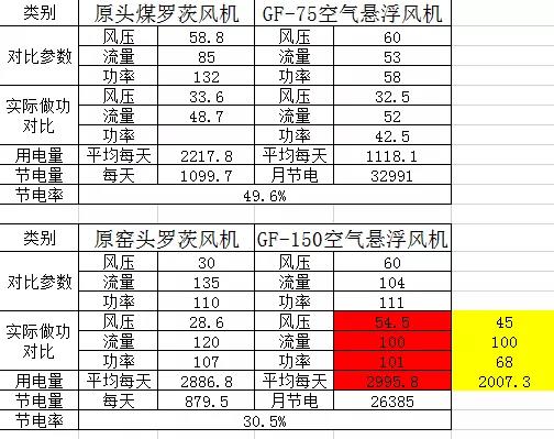 1、頭煤空氣懸浮風(fēng)機(jī):根據(jù)實(shí)際參數(shù)對(duì)比后累計(jì)正常運(yùn)行41天的用電量,對(duì)比后空氣懸浮風(fēng)機(jī)節(jié)電率為49.6%;達(dá)到合同簽訂要求。