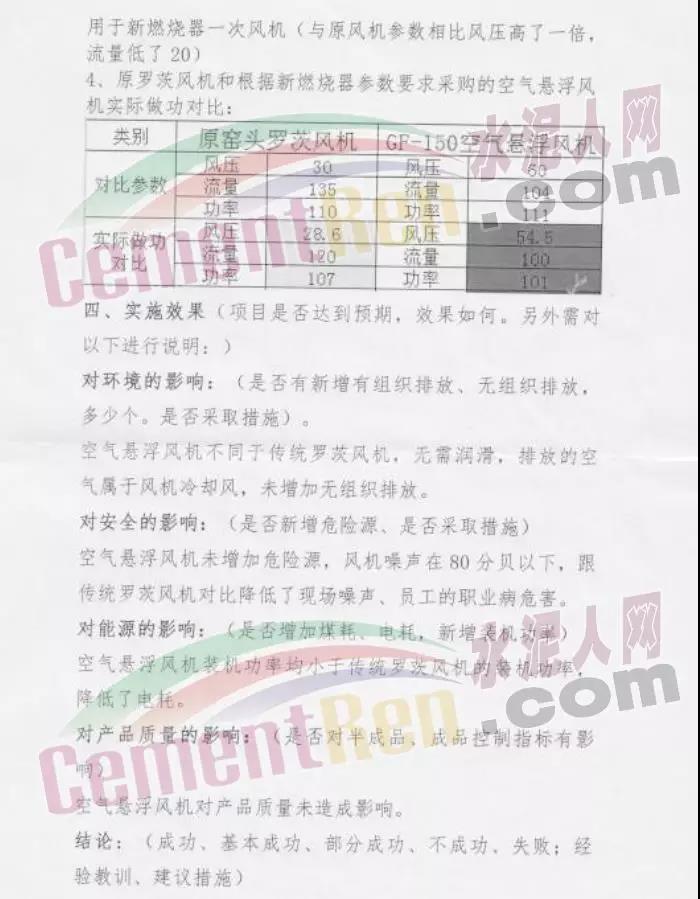 2、窯頭空氣懸浮風(fēng)機(jī):因燃燒器改造后風(fēng)壓要求高于原燃燒器一倍,訂購空氣懸浮風(fēng)機(jī)時(shí)按照新燃燒器設(shè)計(jì)參數(shù)采購,對(duì)比實(shí)際參數(shù)做功時(shí)按照空氣懸浮風(fēng)機(jī)風(fēng)壓、流量接近于原羅茨風(fēng)機(jī)進(jìn)行,上圖中標(biāo)黃數(shù)據(jù)為接近原羅茨風(fēng)機(jī)的參數(shù)和用電量;根據(jù)對(duì)比節(jié)電率為30.5%,達(dá)到合同簽訂要求。