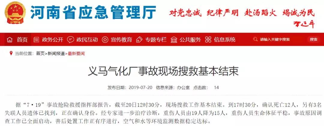 到17時30分,確認死亡12人,另有3名失聯人員遺體已找到,正在確認身份。經專家進一步治療診斷,重傷人員由19人降為15人,重傷人員生命體征平穩,事故原因調查工作已全面啟動,善后處置工作正有序進行,空氣和水等環境監測數據穩定達標。