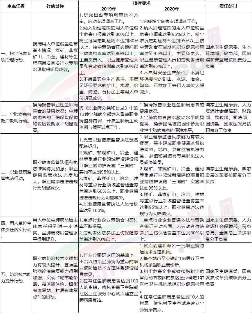 為貫徹落實黨中央、國務院領導同志重要批示精神和《國家職業病防治規劃(2016-2020年)》有關要求,解決當前塵肺病防治工作中存在的重點和難點問題,堅決遏制塵肺病高發勢頭,保障勞動者職業健康權益,特制定本行動方案。