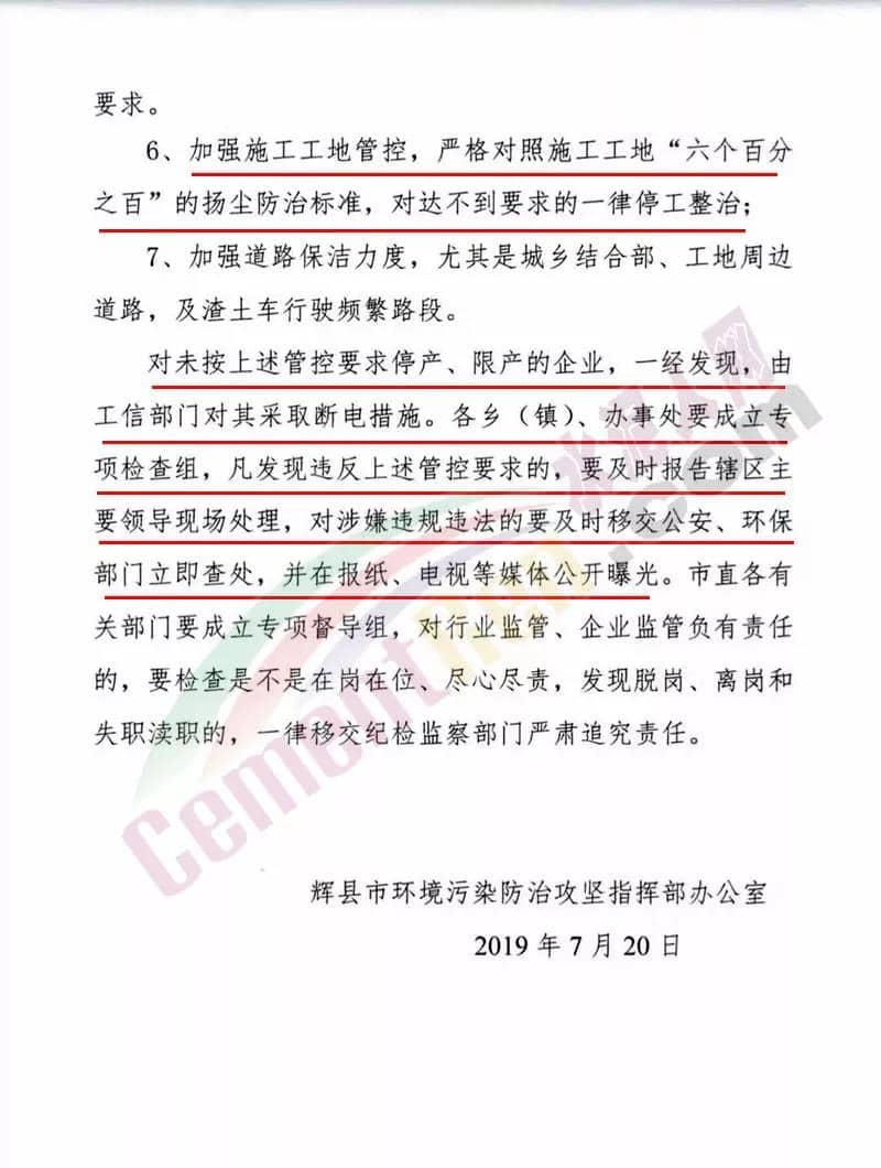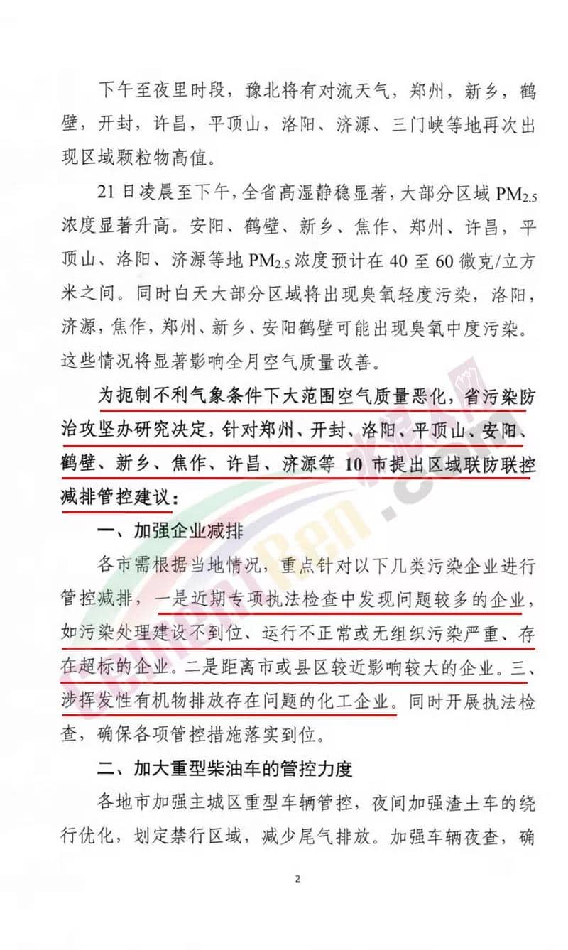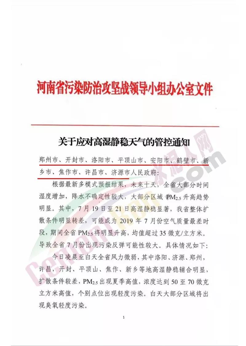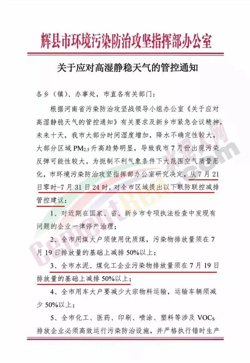 同日,輝縣市環(huán)境污染防治攻堅(jiān)指揮部發(fā)布《關(guān)于應(yīng)對(duì)高濕靜穩(wěn)天氣的管理通知》稱,根據(jù)河南省污染防治攻堅(jiān)領(lǐng)導(dǎo)小組辦公室文件要求及新鄉(xiāng)市緊急會(huì)議精神,為扼制不利氣象條件下大范圍空氣質(zhì)量惡化,輝縣市環(huán)境污染防治攻堅(jiān)指揮部辦公室決定從7月21日零時(shí)至7月31日24時(shí),對(duì)全市區(qū)域提出聯(lián)防聯(lián)控減排管控建議,全市水泥、煤化工企業(yè)污染物排放量須在7月19日排放量的基礎(chǔ)上減排50%以上。
