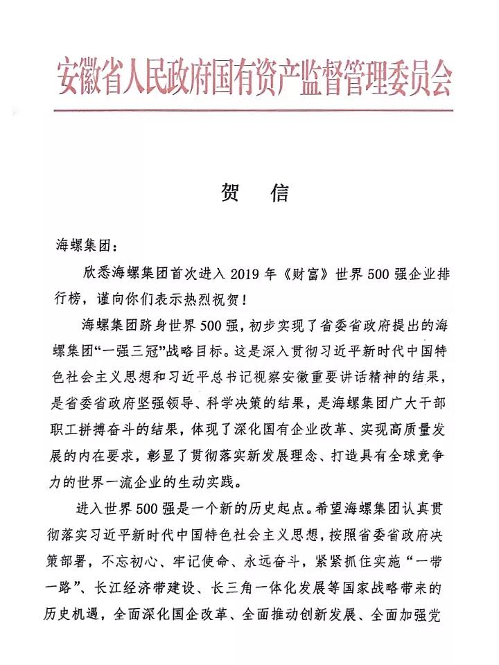 安徽省人民政府網(wǎng)、安徽日報(bào)、人民網(wǎng)安徽、中新社安徽、中安在線等主流媒體紛紛發(fā)布海螺進(jìn)入世界500強(qiáng)消息報(bào)道。安徽省國資委專門向海螺集團(tuán)致賀信。