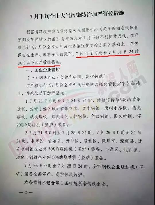 日前,唐山市環保部門發布《關于7月下旬全市大氣污染防治加嚴管控措施的通知》稱:根據環境應急與重污染天氣預警中心《關于近期空氣質量測及管控建議的函》,為有效應對7月下旬不利擴散天氣,在嚴格執行《7月份全大氣污染防治強化管控方案》基礎上,在確保安全生產、汛期安全前提下,7月21日0時至7月31日24時執行以下加嚴管控施。