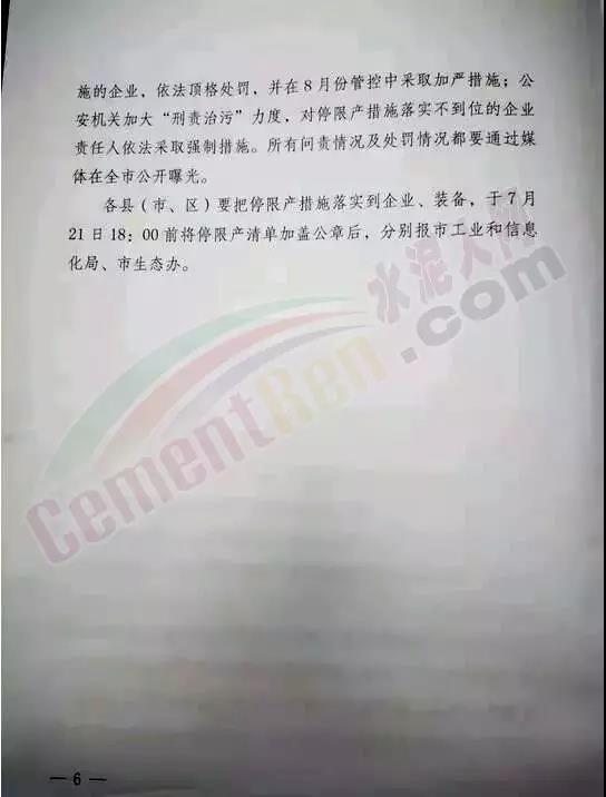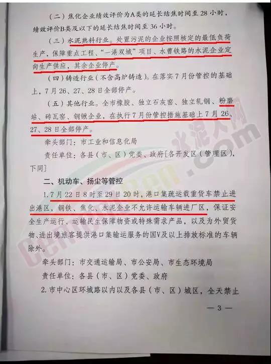 處置污泥的企業按照核定的最低負荷生產,保障重點工程、“一港雙城”項目、水曹鐵路的水泥企業定向生產供應,其余企業停產;他行業。全市粉磨站、磚瓦窯、鋼鍬等企業,在執行7月份管控措施基礎上7月26、27、28日全部停產。