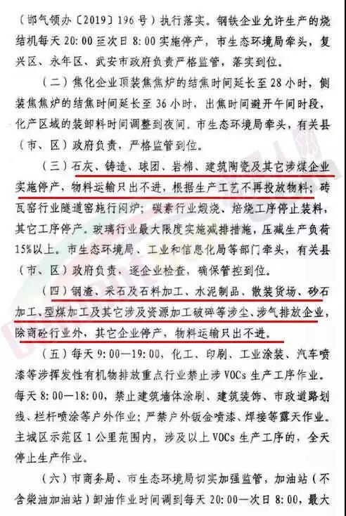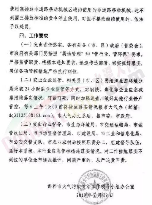 同期,邯鄲市大氣污染防治工作領導小組辦公室也發布了緊急通知,邯鄲市于2019年7月19日20.00-7月26日20:00,對主城區及周邊執行大氣污染防治強化應急管控措施。管控地區包括邯山區、復興區、邯都經濟技術開發區、冀南新區、永年區、武安市、磁縣、成安縣、臨潭縣。