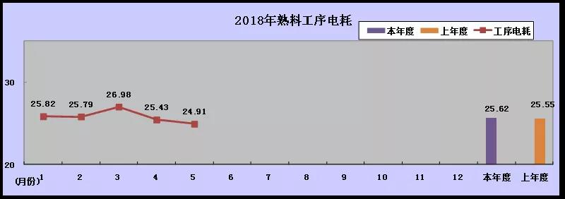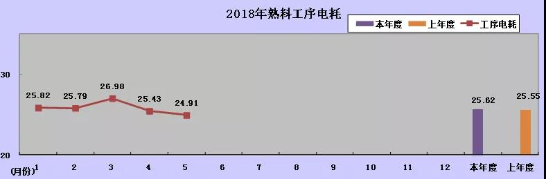 上圖為2018年1-5月熟料工序電耗趨勢圖。5月4日計劃停窯更換燃燒器,熟料工序電耗24.91kw.h/t,比之前的25.5kw.h/t下降約0.6kw.h/t。主要原因:一、新燃燒器采用了高風(fēng)壓低風(fēng)量技術(shù);二、新燃燒器火焰鋼性足,熟料燒結(jié)好,熟料顆粒均勻,篦冷機風(fēng)機群可以降風(fēng),電耗有所下降。
