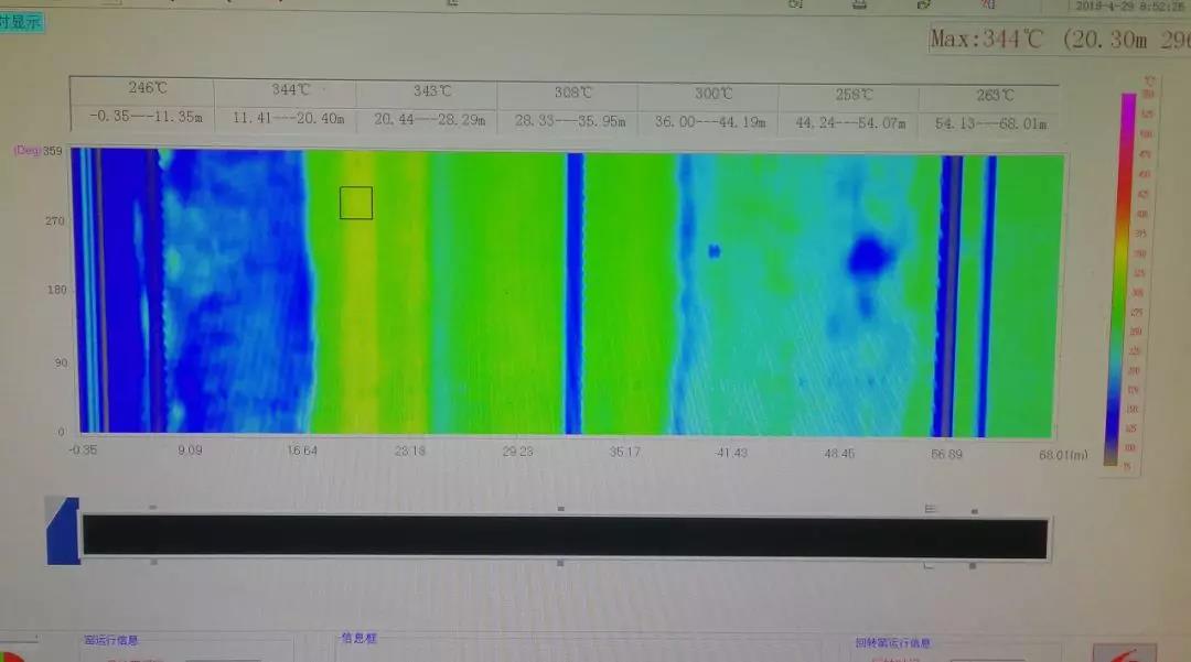 從上圖可知,5月份用新燃燒器后,主窯皮長度為20米左右,更換前為16米左右,增加了4米,增加了熟料的煅燒時間。 更換新燃煤器后,火焰形狀好,不掃窯胴體,一檔前后無高溫點,不用開多臺風(fēng)機冷卻。