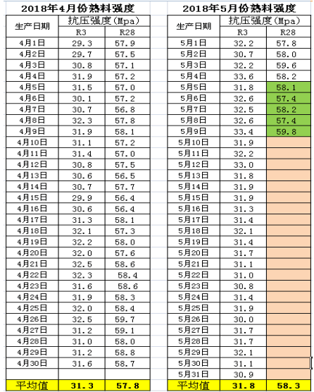 下圖分別為2018年4月和5月出窯熟料強度: