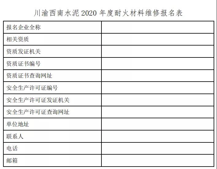 2019 年 9 月 20 日 以 前 發(fā)送到m17311321669@163.com,文件名稱一律以“耐火材料維修+公司簡稱+資質(zhì)名稱”的形式發(fā)送。報名預(yù)審不接受書面材料。