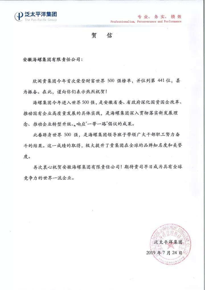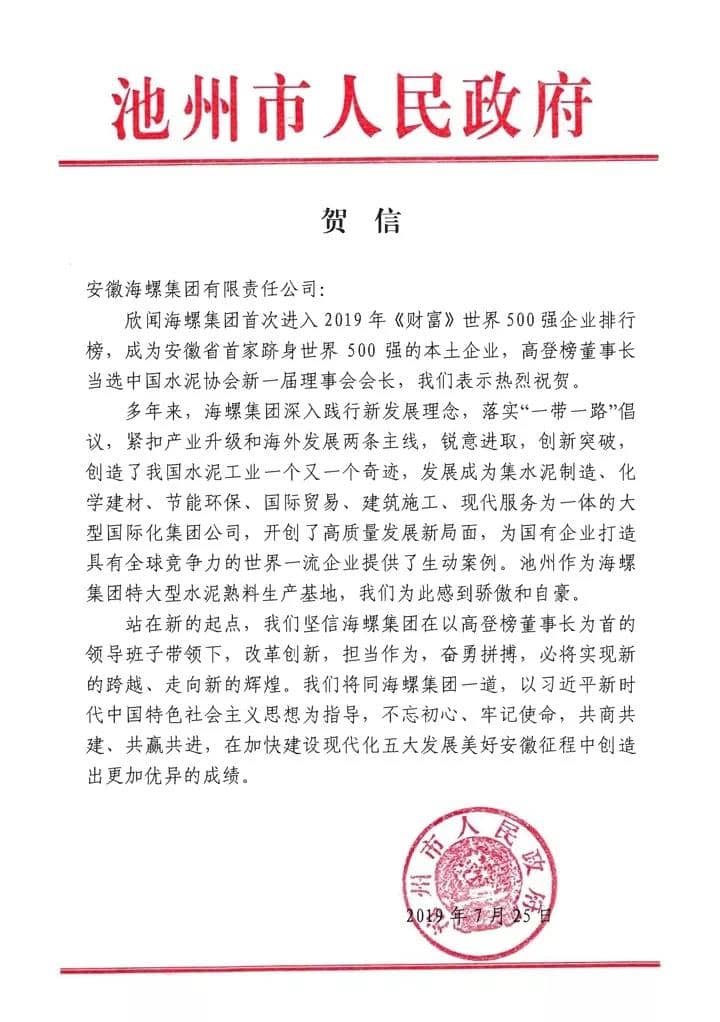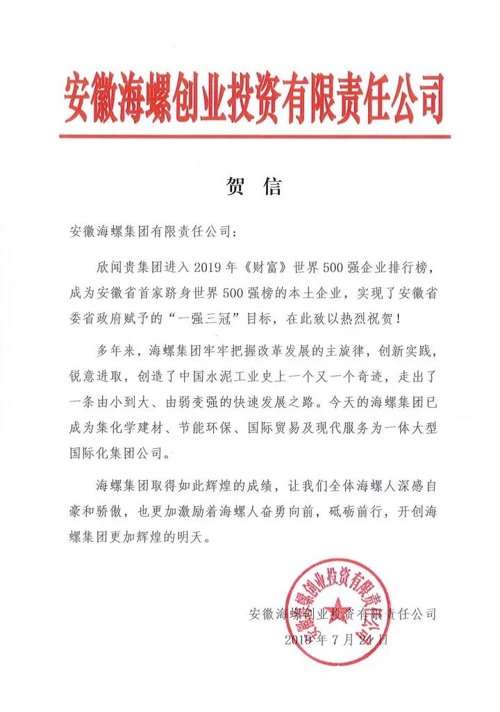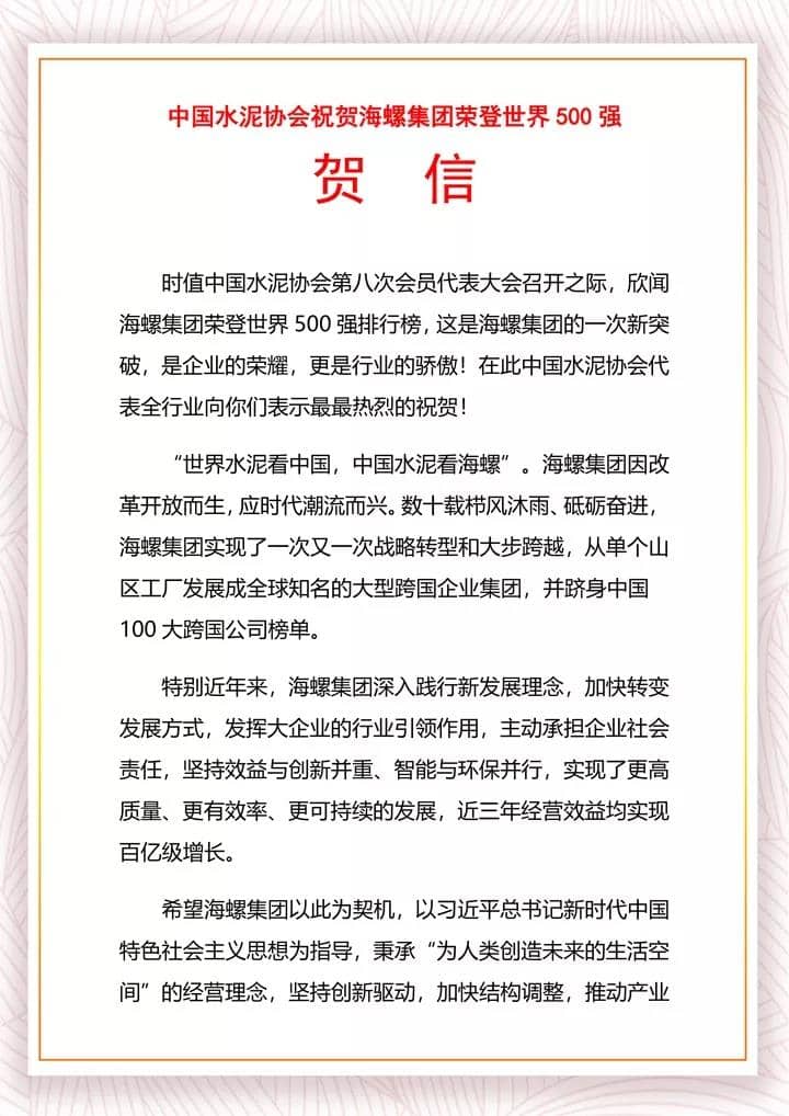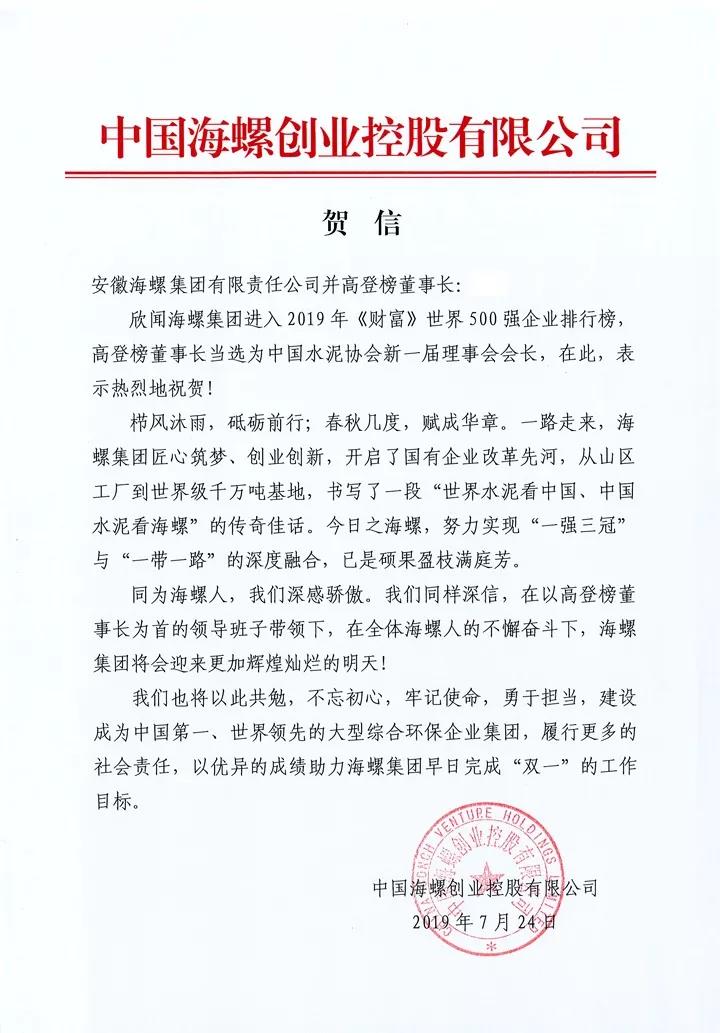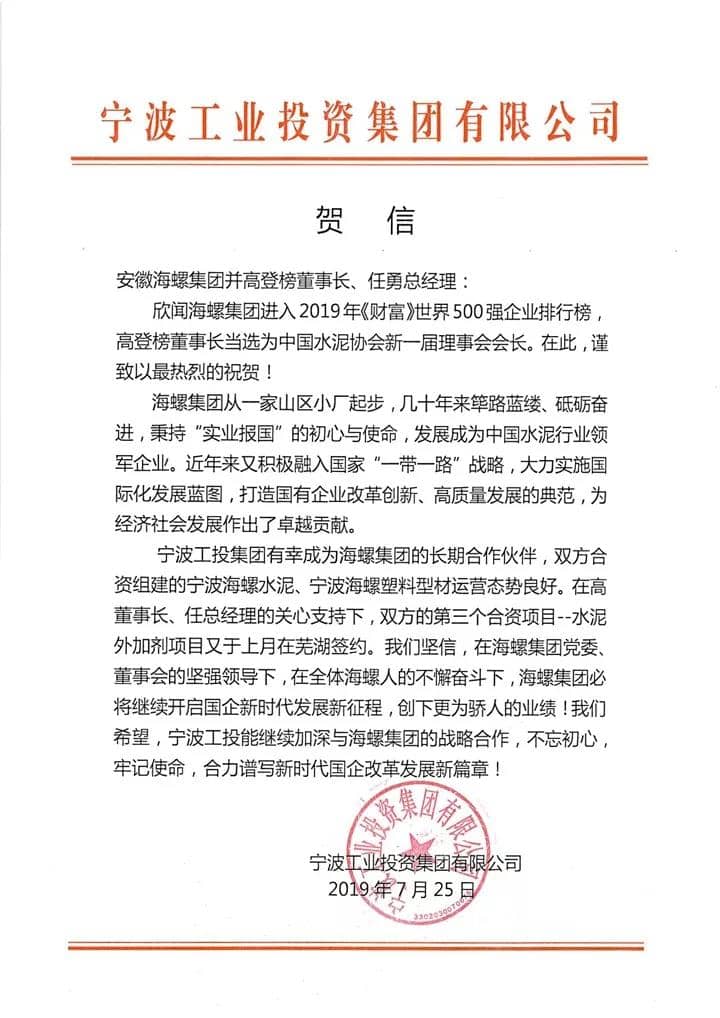 7月22日,海螺集團榮登財富世界500強企業榜單。水泥人網第一時間做了相關報道。7月25日,海螺集團董事長高登榜當選中國水泥協會新一屆理事會會長,水泥人網行業總監張蘭第一時間向高登榜董事長表示祝賀。 近日,池州市人民政府,中國建筑材料聯合會、中國水泥協會,泛太平洋集團、三一集團、日本川崎重工等企業向海螺集團發來賀信。 池州市人民政府 中國建筑材料聯合會 中國水泥協會 泛太平洋集團 三一集團 日本川崎重工 寧波工業投資集團 海螺創業 海創投資