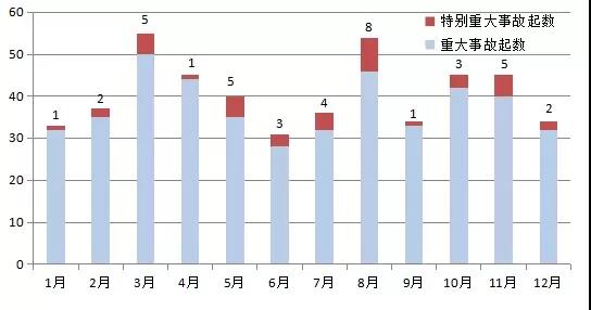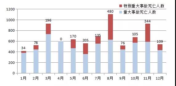 其中,特別重大事故在近十年的8月份發生最為集中,共發生8起、死亡480人,占近十年特別重大事故起數、死亡人數的20.0%、24.8%;分別比全年月平均值高出11.7和16.5個百分點,在12個月份中均位列第一位。