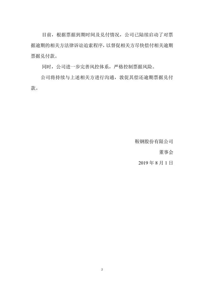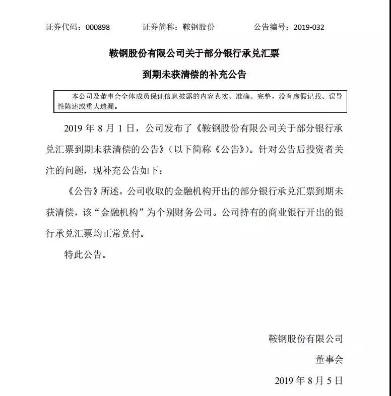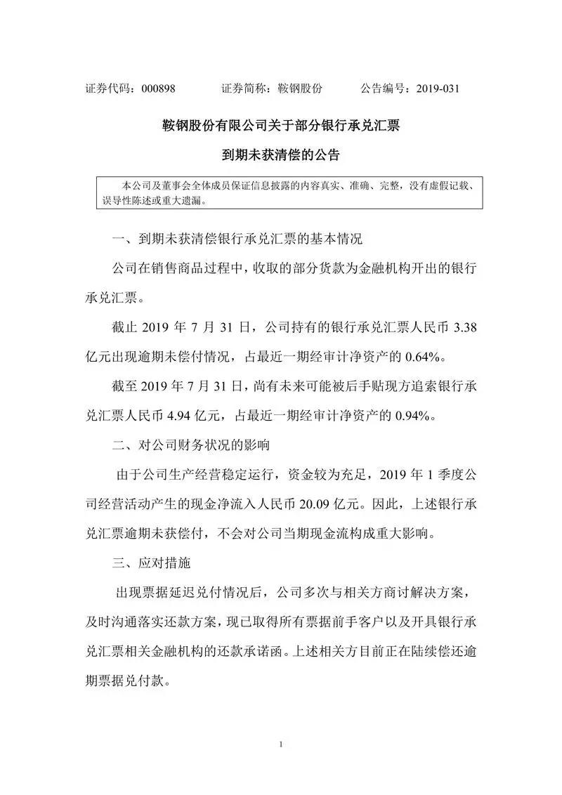 據(jù)水泥人網(wǎng)了解,鞍鋼股份日前發(fā)布的一則“部分銀行承兌匯票到期未獲清償”的公告迅速引發(fā)市場(chǎng)關(guān)注。截至7月31日,尚有未來(lái)可能被后手貼現(xiàn)方追索銀行承兌匯票4.94億元,兩者銀行承兌票據(jù)合計(jì)8.32億元。