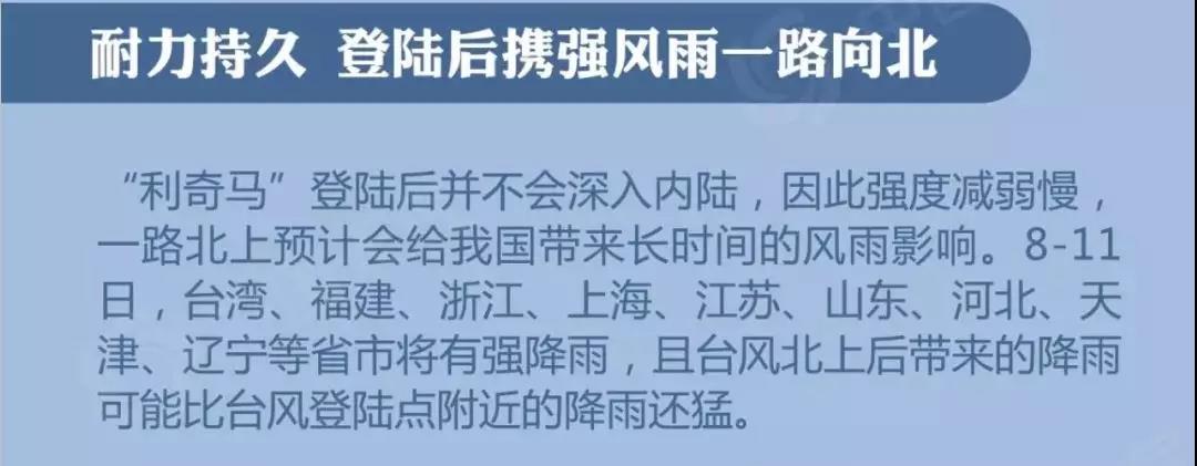 持續時間長——臺風“利奇馬”未來登陸中國后,也并不會深入內陸,強度減弱慢,比較有利于維持臺風環流,一路北上預計會給中國帶來長時間風雨影響。