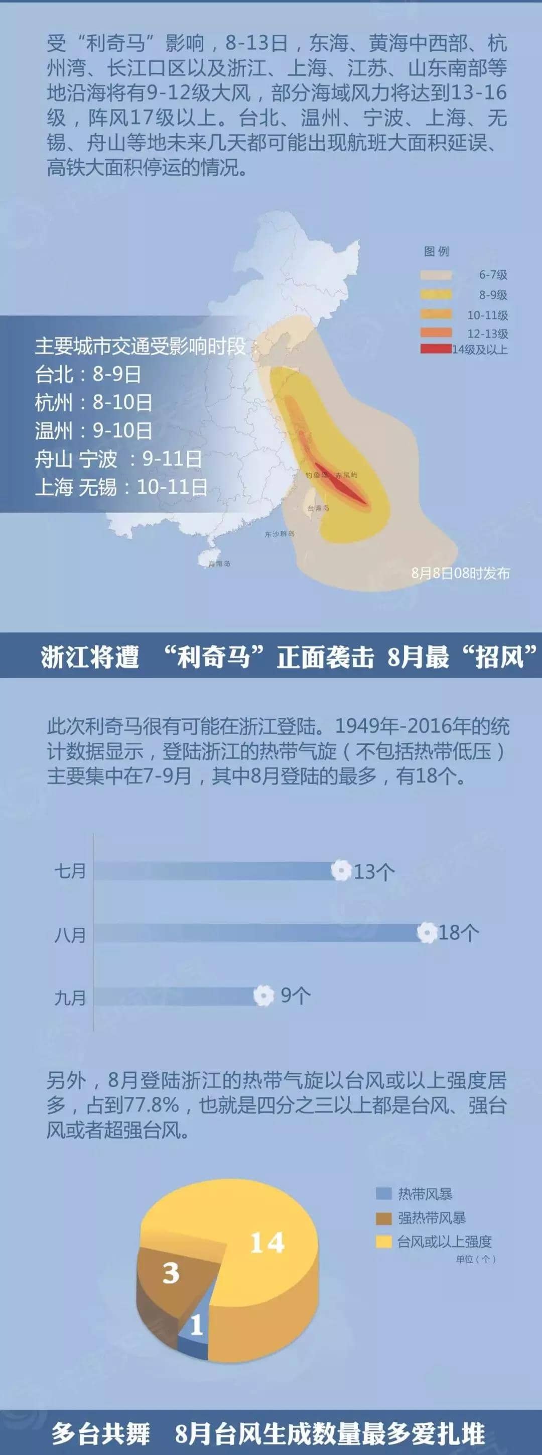 風雨強度大——8日至13日,東海、黃海中西部、杭州灣、長江口區以及浙江、上海、江蘇、山東南部等地沿海將有9至12級大風,部分海域風力將達到13至16級,陣風17級以上。8日至11日,臺灣島、浙江中東部、上海、江蘇東部、山東東部、遼東半島等地將有大暴雨,臺灣島中部、浙江東部等地局地特大暴雨,浙江東部累計降雨量300至500毫米,臺灣島中部達500至700毫米。