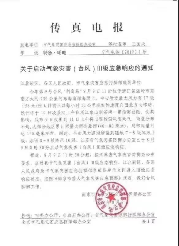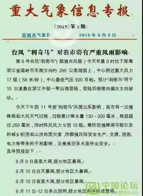 8月9日宣城市氣象局發布重大氣象信息專報稱,第9號臺風“利奇馬”(超強臺風)今天早晨8時位于距離浙江省溫嶺市東南方向約290公里海面上,中心附近最大風力17級(58米/秒),中心最低氣壓920百帕。9日下午至11日受“利奇馬”外圍 云系影響,宣城市有一次強降雨和大風天氣過程。需防范強降雨可能引發的城鄉積澇和山洪地質災害,防御強風給安全生產、交通、旅游、電力等帶來的不利影響,需注意高空及水面作用安全。