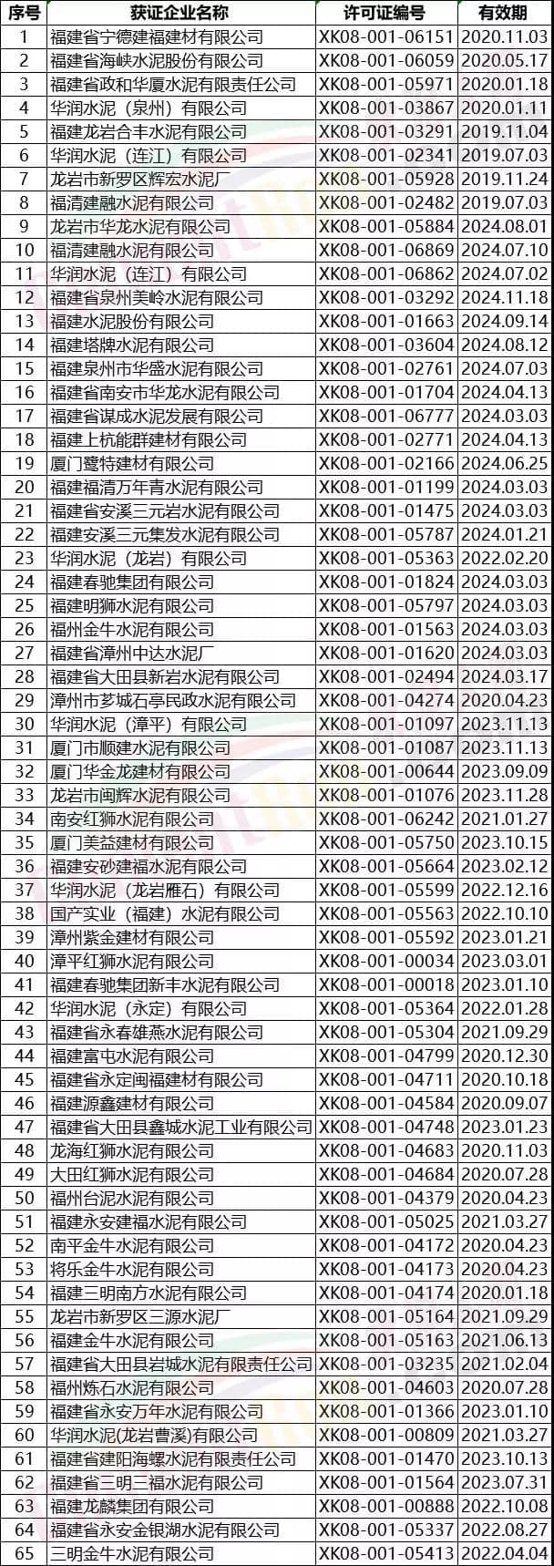福建省部分水泥企業名單