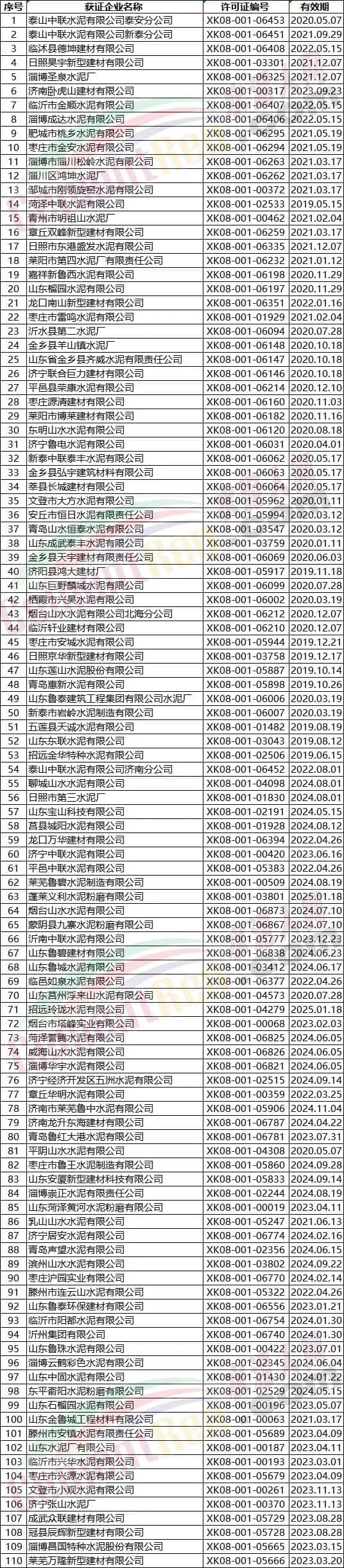 山東省部分水泥企業名單