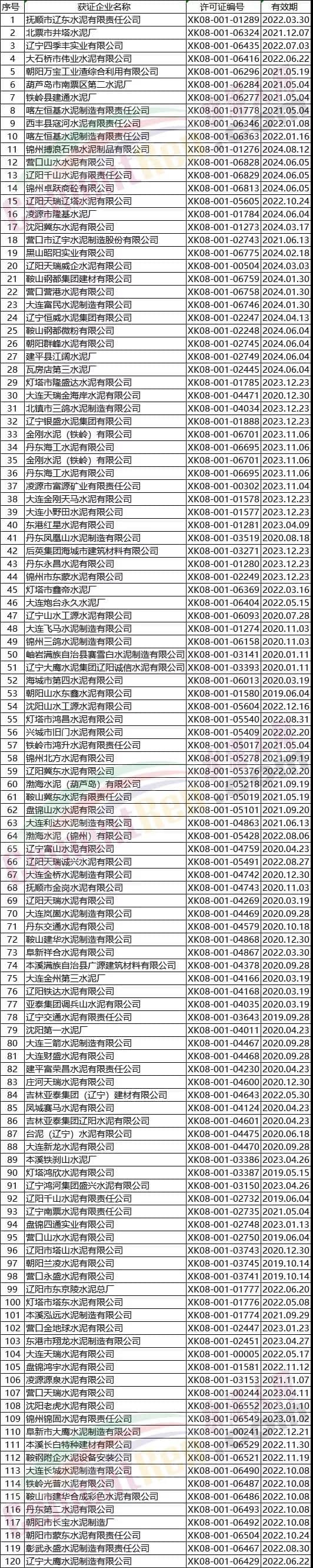 遼寧部分水泥企業名單