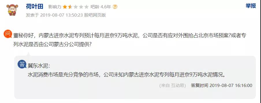 董秘回復稱:水泥消費市場是充分競爭的市場,公司未知內蒙古進京水泥專列每月進京9萬噸水泥情況。