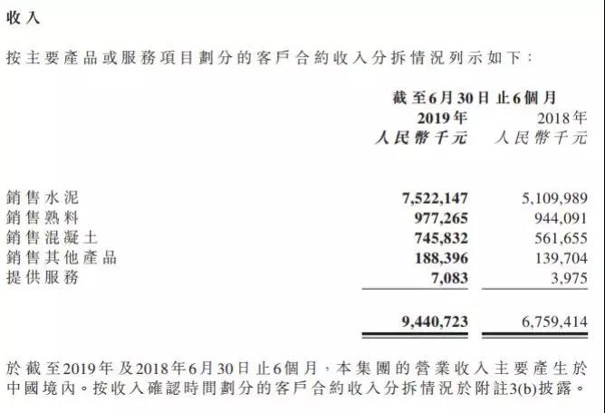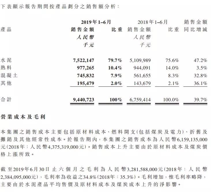 公告顯示,截至2019年6月30日,集團水泥產能1億噸,熟料產能5107萬噸,商品混凝土產能1930萬立方米。報告期內,集團銷售水泥、熟料合計2393.2萬噸,同比增加27.8%。