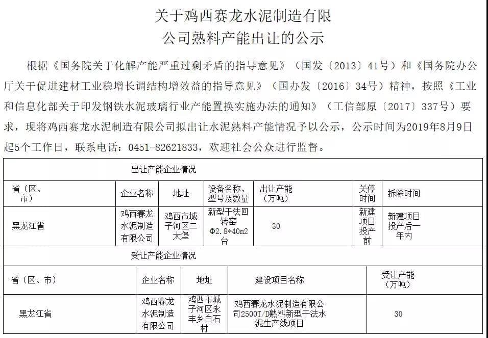 公示文件中提到的產能出讓企業雞西賽龍水泥制造有限公司位于黑龍江雞西市城子河區二太堡的熟料產能30萬噸/年(新型干法回轉窯Φ2.8×40m×2)。受讓產能企業為位于雞西市城子河區永豐鄉白石村雞西賽龍水泥制造有限公司的2500T/D熟料新型干法水泥生產線項目。