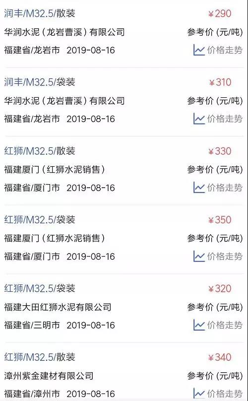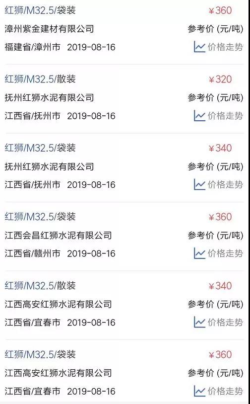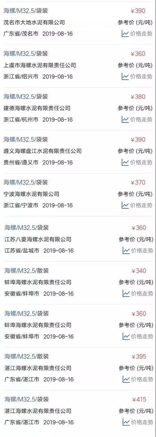 水泥人網信息中心PC32.5R水泥參考價(時間:2019年8月16日)