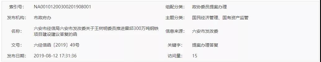 關于王樹明委員推進霍邱300萬噸鋼鐵項目建設建議答復的函