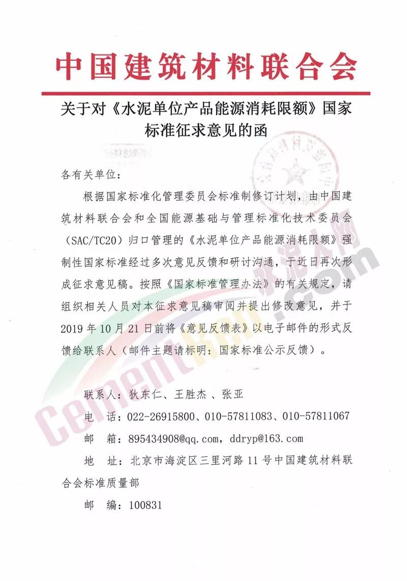 日前,來源:中國建筑材料聯(lián)合會標準質(zhì)量部 發(fā)布關(guān)于對《水泥單位產(chǎn)品能源消耗限額》國家標準征求意見的函天氣:根據(jù)國家標準化管理委員會標準制修訂計劃,由中國建筑材料聯(lián)合會和全國能源基礎(chǔ)與管理標準化技術(shù)委員會歸口管理的《水泥單位產(chǎn)品能源消耗限額》強制性國家標準經(jīng)過多次意見反饋和研討溝通,于近日再次形成征求意見稿。