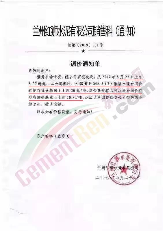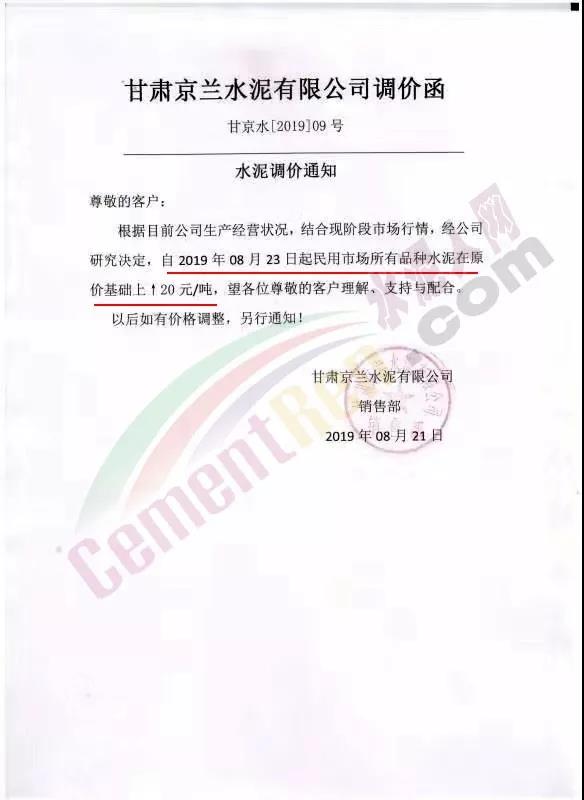 甘肅京蘭水泥有限公司調價函稱,自8月23日起民用市場所有品種水泥在原價基礎上上調20元/噸。