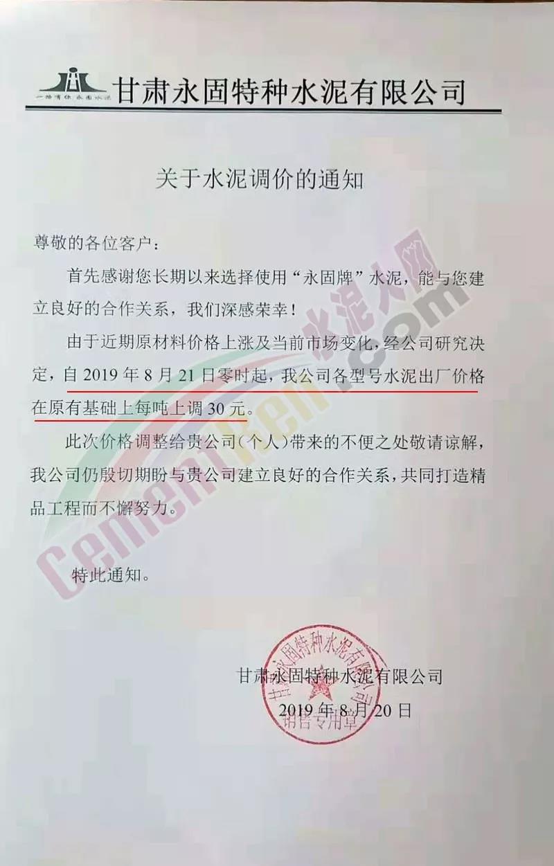 甘肅永固特種水泥有限公司《關于水泥調價的通知》稱,由于近期原材料價格上漲及當前市場變化 ,經(jīng)公司研究決定 自8月21日零時起,公司各型號水泥出廠價格在原有基礎上每噸上調30元/噸。