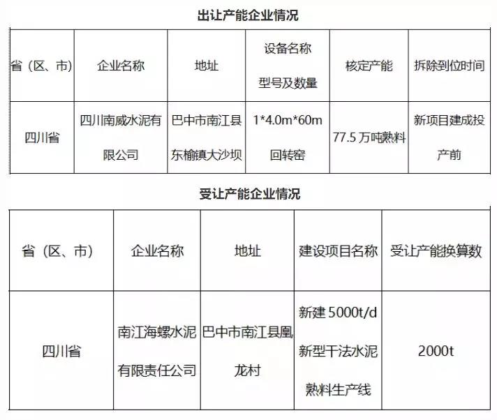 日前,四川省巴中市經信委發布《四川南威水泥有限公司產能出讓公告》稱,四川南威水泥有限公司產能將出讓77.5萬噸熟料產能給南江海螺新建5000噸/日熟料生產線。