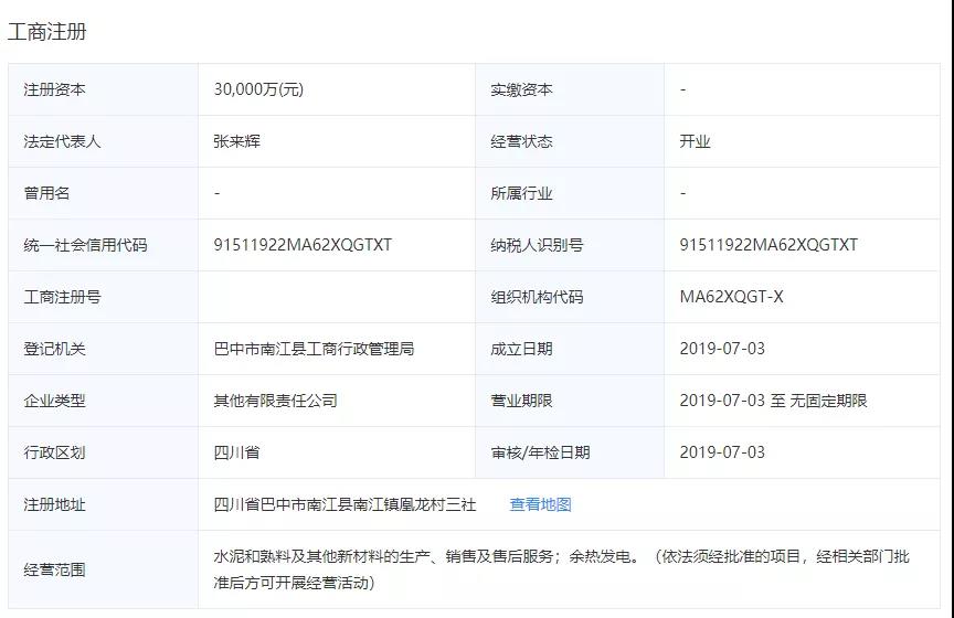 據水泥人網了解,四川南威水泥為安徽海螺水泥股份有限公司獨資公司,注冊資本16800萬,于2009年初點火投產。受讓產能企業南江海螺水泥有限責任公司成立于2019年07月03日,注冊地位于四川省巴中市南江縣南江鎮凰龍村三社,法人代表為張來輝。注冊資本30000萬。經營范圍包括水泥和熟料及其他新材料的生產、銷售及售后服務;余熱發電等。