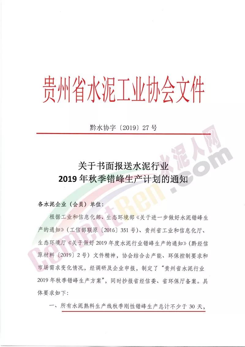 就在當地企業一籌莫展之際,貴州省水泥協會緊急發布秋季錯峰停產文件,要求省內所有水泥熟料生產線秋季剛性錯峰生產總計不少于30天,原則上每月錯峰生產10天/窯。