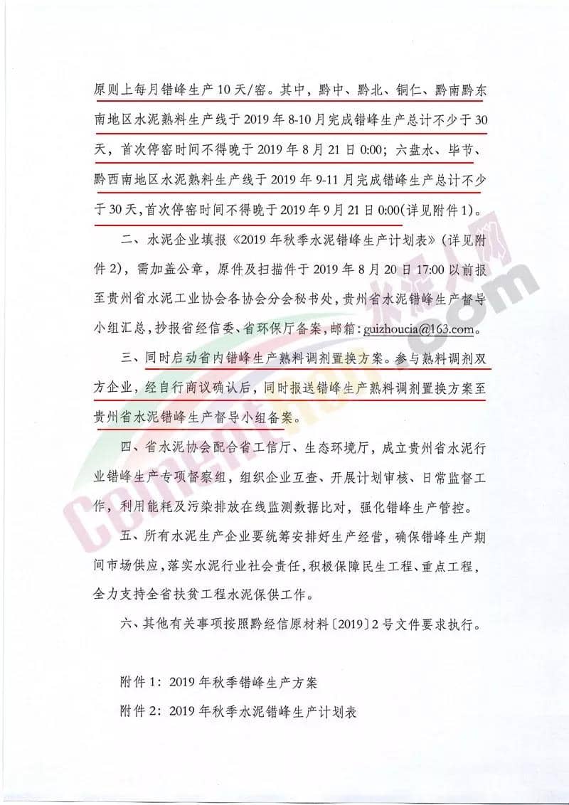 其中,黔中、黔北、銅仁、黔南黔東南地區水泥熟料生產線于2019年8-10月完成錯峰生產總計不少于30天,首次停窯時間不得晚于2019年8月21日0:00;六盤水、畢節、黔西南地區水泥熟料生產線于2019年9-11月完成錯峰生產總計不少于30天,首次停窯時間不得晚于2019年9月21日0:00。