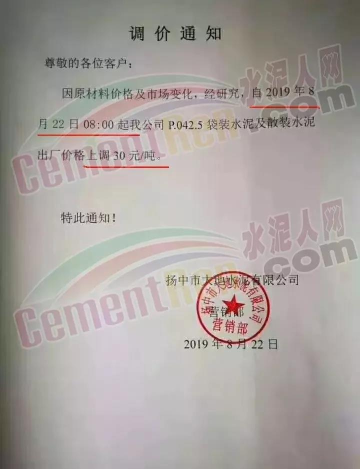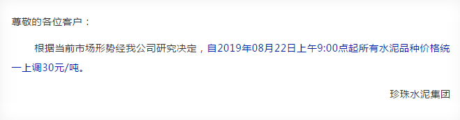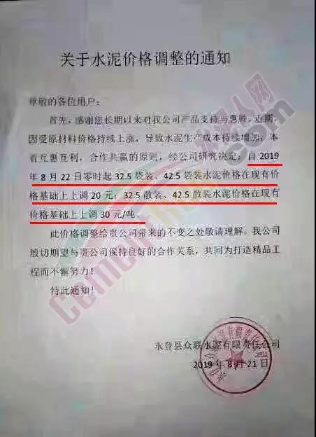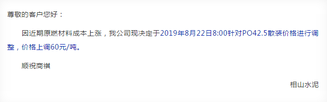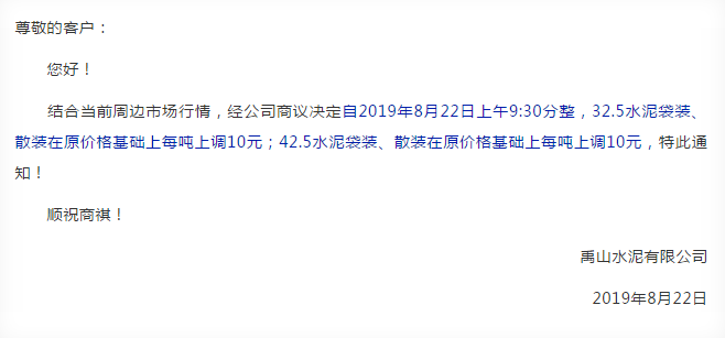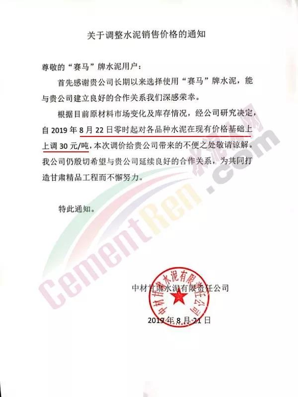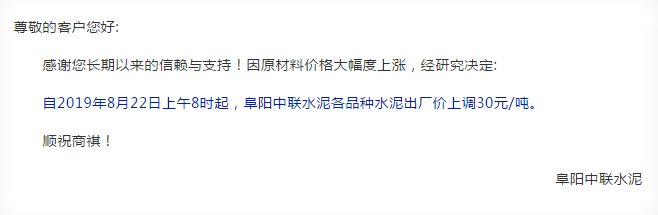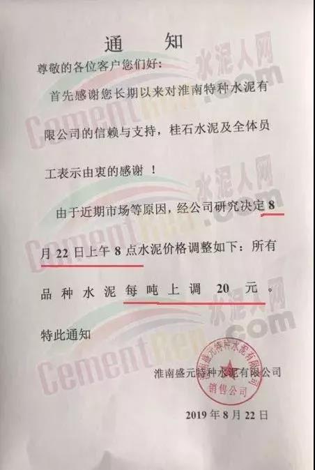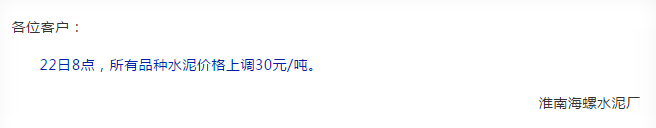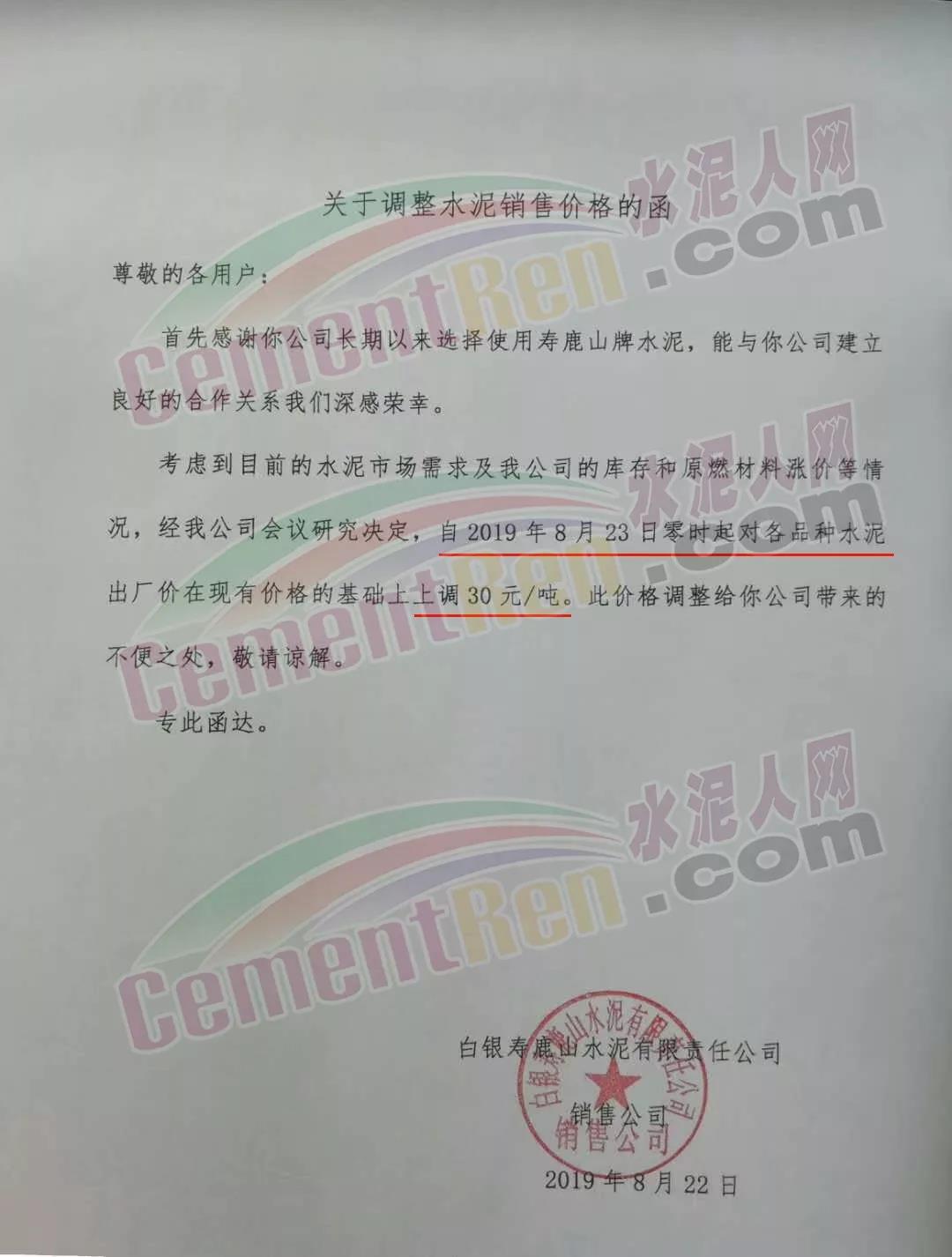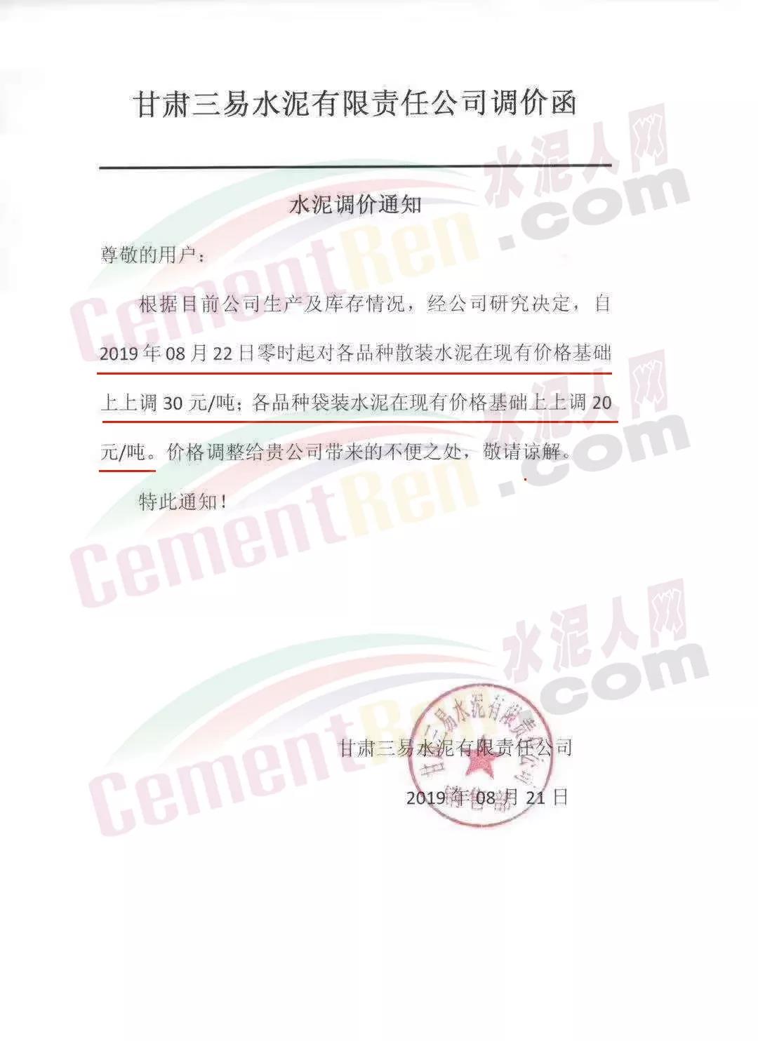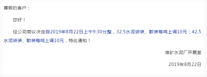 水泥人網通訊員消息:昨日(8月22日),皖北主導企業,相山海螺,宿州海螺,蕭縣天瑞等企業通知水泥價格在原價基礎上上調30元/噸。區域內其他也企業陸續跟漲,部分企業的通知函如下: 同期,甘肅蘭州及周邊區域企業自20日發布一波漲價通知后昨日又有多家企業陸續發出調價通知函稱上調水泥價格30元/噸。從各企業發布的通知函可見,白銀壽鹿山水泥、蘭州甘草環保建材、甘肅京蘭水泥、蘭州紅獅水泥等都是自今日起上調水泥價格。調價幅度均為20-30元/噸。