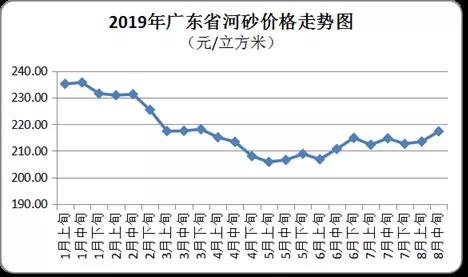 8月中旬,全省河砂平均購進(jìn)價(jià)為每立方米217元,環(huán)比上升1.8%(與2019年8月上旬相比,下同)。其中,粵西和珠三角地區(qū)購進(jìn)價(jià)漲幅較大,均價(jià)分別為每立方米220元和200元,環(huán)比分別上升3.53%和3.61%。