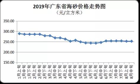 4、海砂價(jià)格環(huán)比持平 8月中旬全省海砂(淡化處理)平均購進(jìn)價(jià)為每立方米252元,價(jià)格維持不變。其中,粵北和珠三角地區(qū)購進(jìn)價(jià)分別為每立方米225元和272元。
