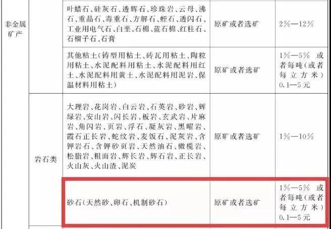 據(jù)此前《中華人民共和國資源稅法(征求意見稿)》透露內(nèi)容顯示:對砂石(天然砂、卵石、機制砂石)征收1%-5%或者1元-10元/立方米資源稅。稅法規(guī)定對衰竭期礦山開采的礦產(chǎn)品減征30%資源稅,授權(quán)各省對低品位礦減免資源稅。