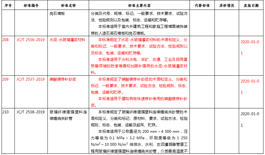 水泥行業:標準編號為JC/T 2536-2019的水泥-水玻璃灌漿材料;標準編號為JC/T 2537-2019的磷酸鎂修補砂漿;標準編號為JC/T 2532-2019的水泥混凝土制品生產用蒸壓釜安全操作規程;標準編號為JC/T 2533-2019的預拌混凝土企業安全生產規范;標準編號為JC/T 60002-2019的預拌混凝土攪拌站單方成本計算方法及評價指標;這些標準被工信部批準,并且上述這些標準實施日期都是2020年1月1日。