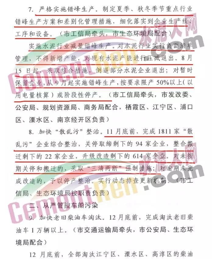 實施水泥行業減量錯峰生產。對水泥行業實行負面清單管理,不得新增產能,對現有水泥產能進行壓減退出。8月15日起,采取綜合措施,倒逼部分水泥企業退出;對暫時保留企業,從9月份起實施錯峰生產,按要求限產50%以上(以用電量核算)或階段性停產。(市工信局牽頭,市發改委、公安局、規劃資源局、商務局配合,棲霞區、江寧區、浦口區、溧水區、南京經開發區負責)