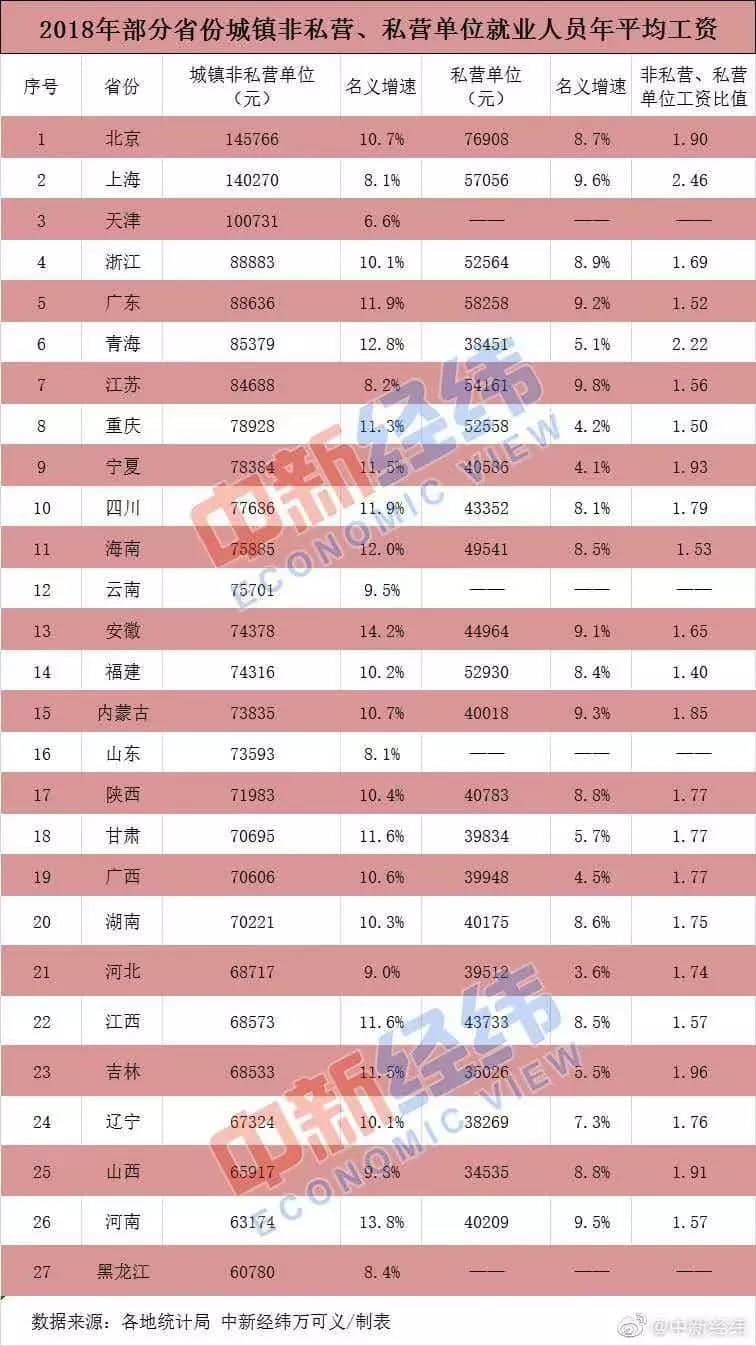 再結合日前公布的去年部分省份城鎮非私營、知識營單位就業人員年平均工資來看,北京以145766元高居非私營企業榜首,上海140270元,天津100731元排名第二第三,19個城市的增速在兩位數以上,安徽省以14.2%排名第一,河南13.8%排名第二。