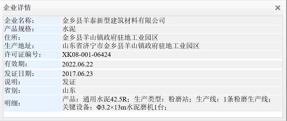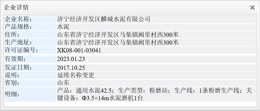 市場監(jiān)管總局生產(chǎn)許可證辦公室數(shù)據(jù)顯示,濟寧經(jīng)濟開發(fā)區(qū)麟城水泥有限公司生產(chǎn)地址位于山東省濟寧經(jīng)濟開發(fā)區(qū)馬集鎮(zhèn)闕里村西300米。企業(yè)擁有一條水泥粉磨生產(chǎn)線,其關(guān)鍵設(shè)備為Φ3.5×14m水泥磨機1臺。