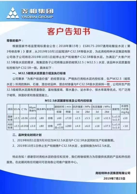 堯柏集團客戶告知書稱,堯柏集團推出的M32.5砌筑水泥質量指標控制與P.C32.5R保持一致。